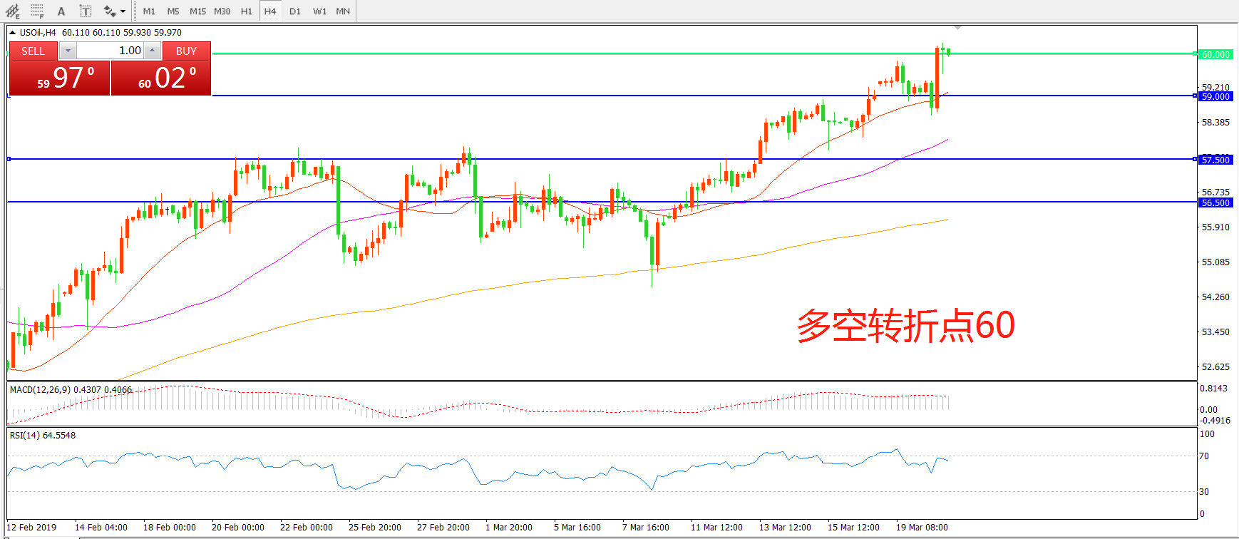 交易策略:在60.00之下看涨,目标62.00     65.00