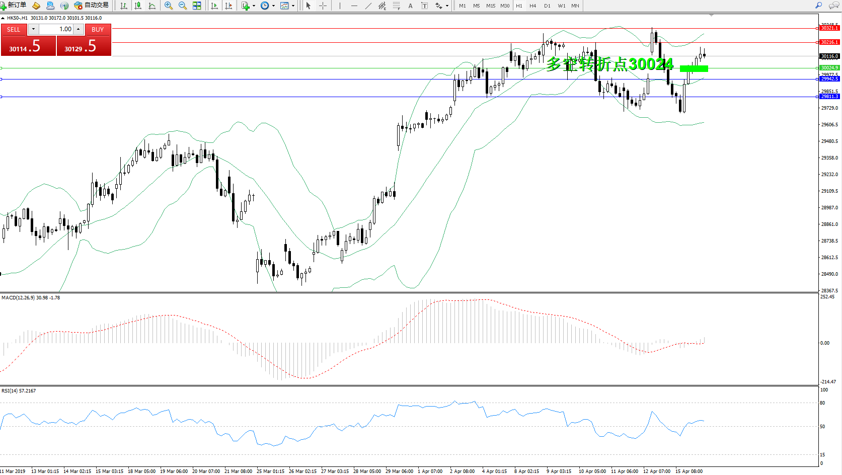技术点评:继续在布林带通道内维持宽幅震荡,30000点关口或将持续数日整理,MACD指标0轴线附近持续徘徊,RSI指标50均衡线上方缓慢上行;