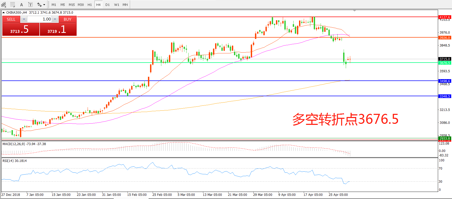 4小时图看,沪深300指数跳空低开一路下挫,于3676.5附近暂时企稳,短期走势依然偏空,21均线下穿形成死叉,MACD绿柱增加,RSI指标向下,日内以空头思路为主,切忌追多。