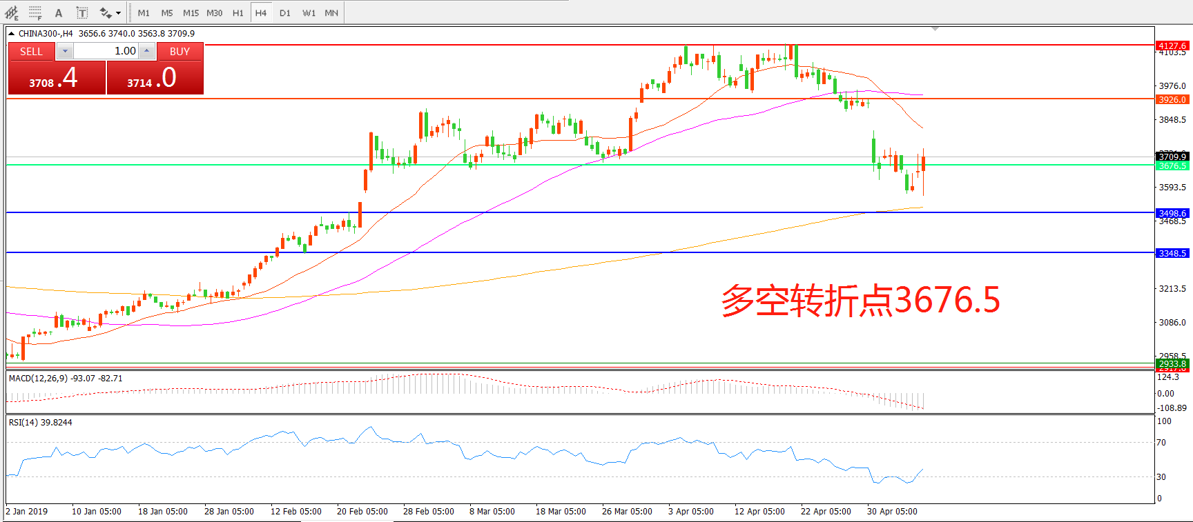 4小时图看,沪深300指数在连续下行后企稳,200均线成为短线支撑,短期均线依然向下,MACD绿柱减少,RSI指标拐头,日内有小幅反弹可能,日内重点关注3676.5。