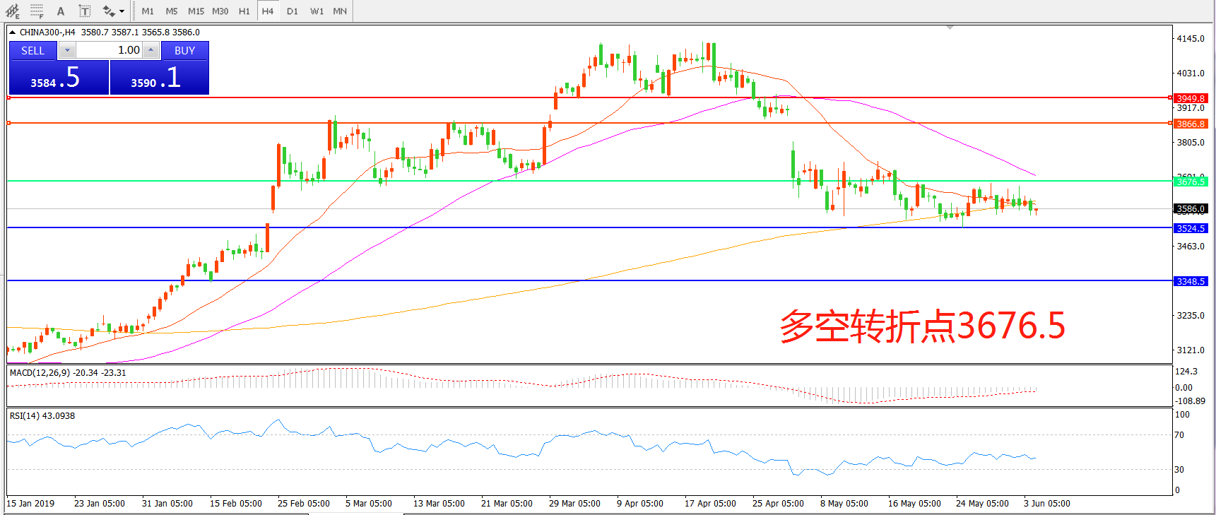 4小时图看,沪深300指数在跌破3676.5后陷入震荡走势,振幅逐渐收窄, 200均线成为短期支撑,MACD绿柱缩短,RSI指标拐头向下,日内以震荡下行思路对待。