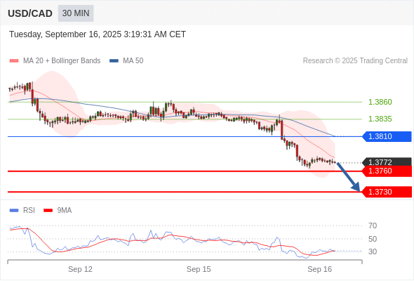 美元/加元 当日内: 期待1.3760。