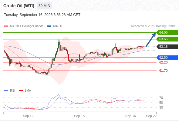 在 62.50 之上,看涨,目标价位为 63.65 ,然后为 64.05 。