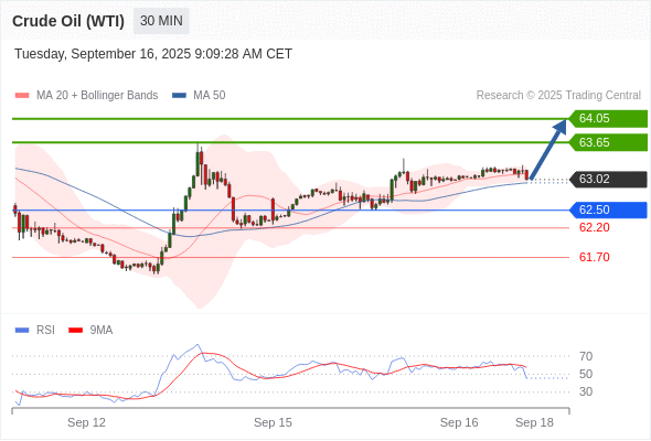 在 62.50 之上,看涨,目标价位为 63.65 ,然后为 64.05 。