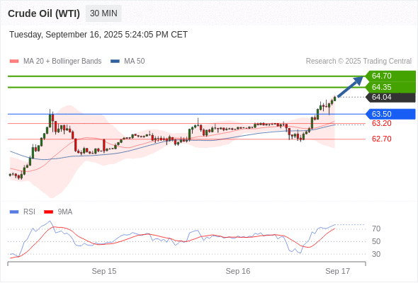 美国原油 (WTI) 期货 (X5) 当日内: 在63.50之上,看涨。
