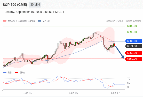 在 6680.00 之下,看跌,目标价位为 6660.00 ,然后为 6650.00 。