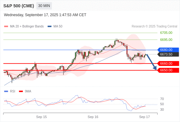 在 6680.00 之下,看跌,目标价位为 6660.00 ,然后为 6650.00 。