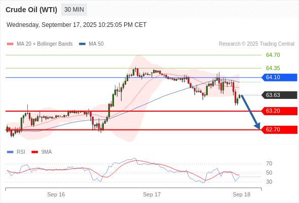 在 64.10 之下,看跌,目标价位为 63.20 ,然后为 62.70 。