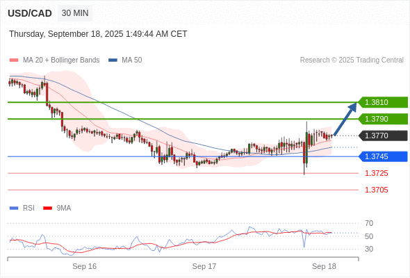 在 1.3745 之上,看涨,目标价位为 1.3790 ,然后为 1.3810 。