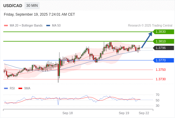 在 1.3770 之上,看涨,目标价位为 1.3810 ,然后为 1.3830 。