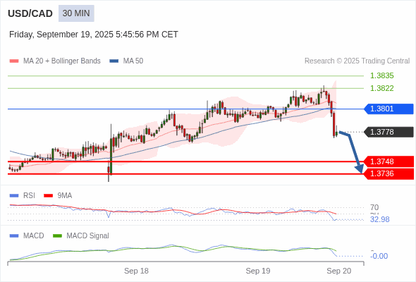 美元/加元 当日内 : 看跌,在 1.3801 之下。
