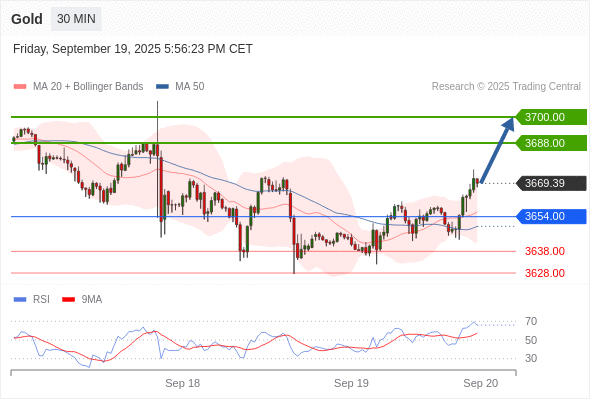 在 3654.00 之上,看涨,目标价位为 3688.00 ,然后为 3700.00 。