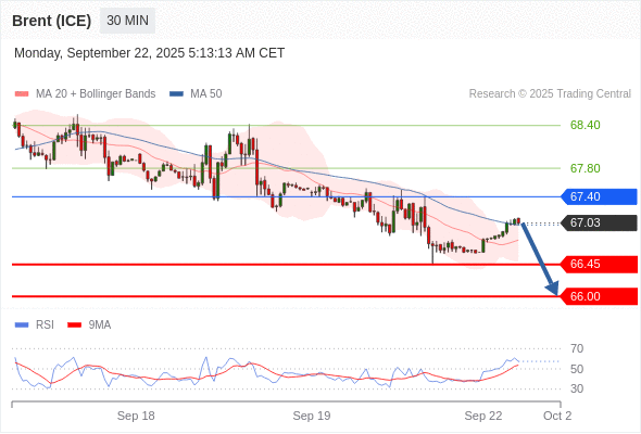 交易策略: 在 67.40 之下,看跌,目标价位为 66.45 ,然后为 66.00 。