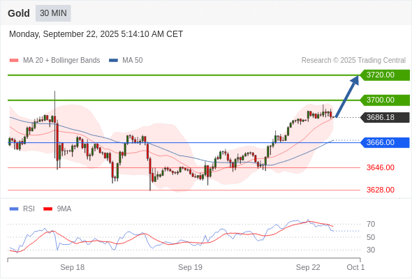 在 3666.00 之上,看涨,目标价位为 3700.00 ,然后为 3720.00 。