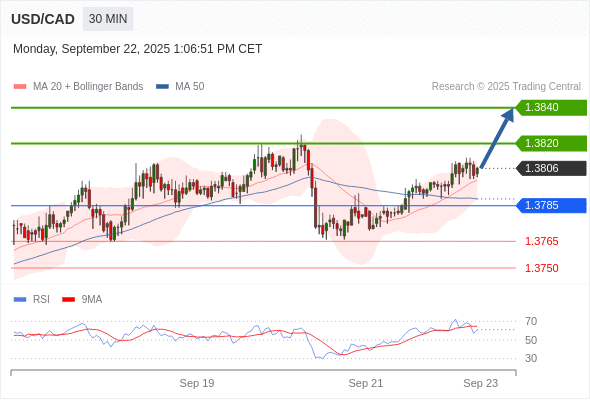 在 1.3785 之上,看涨,目标价位为 1.3820 ,然后为 1.3840 。