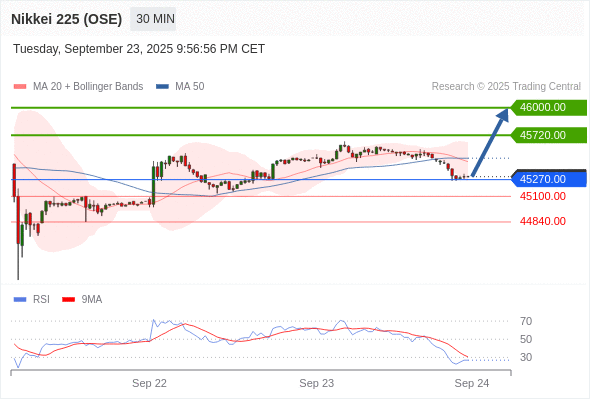 日经225股指期货 (OSE) 当日内: 超短线(当日内)支撑位在45270.00附近。