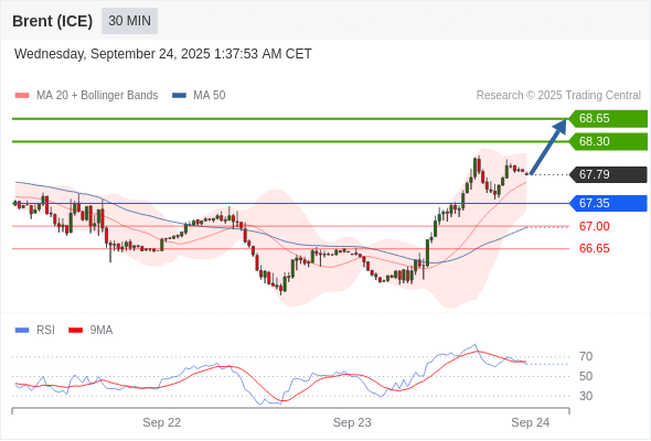 在 67.35 之上,看涨,目标价位为 68.30 ,然后为 68.65 。