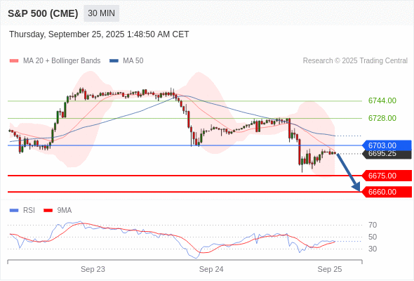 在 6703.00 之下,看跌,目标价位为 6675.00 ,然后为 6660.00 。