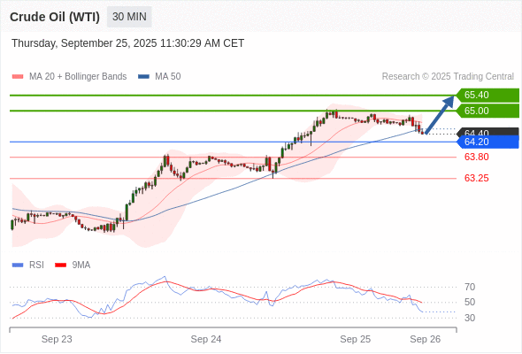 在 64.20 之上,看涨,目标价位为 65.00 ,然后为 65.40 。