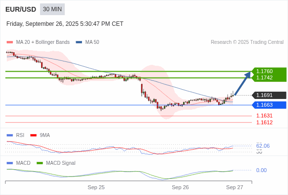 欧元/美元 当日内 : 看涨,当 1.1663 为支撑位。