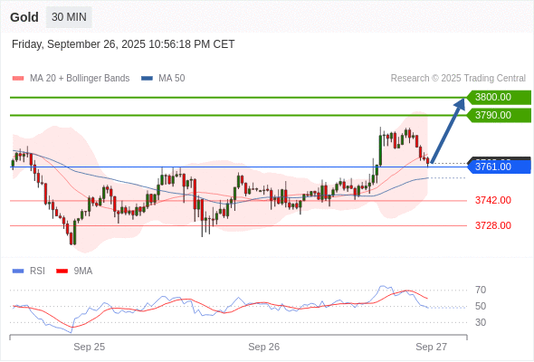 在 3761.00 之上,看涨,目标价位为 3790.00 ,然后为 3800.00 。