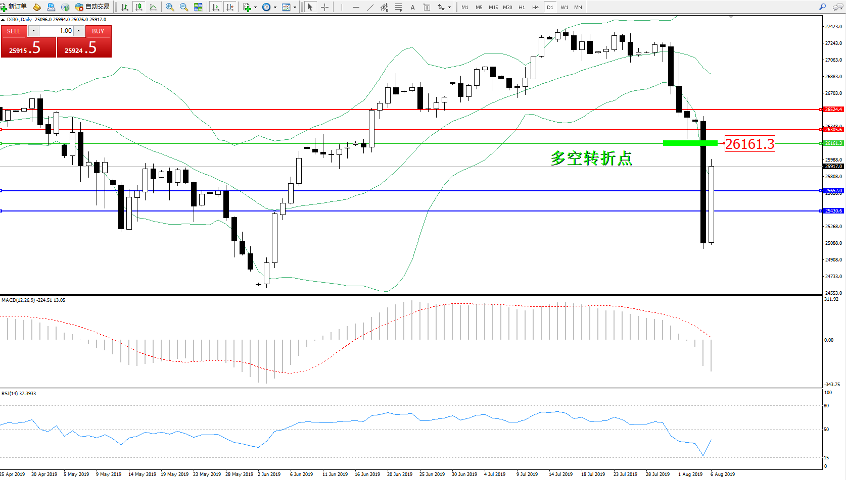 道琼斯指数8月6日(周二)收盘上涨311.80点,涨幅1.21%,报26029.52点。全球贸易局势升级中,美联储进一步宽松预期升温,令美元跌至两周低点,但避险环境中,美元也有一定避险需求,市场认为美元资产有过分下跌的嫌疑,且日内美债收益率探底回升,也支撑了美元走高,展望未来,美元料维持中期震荡的格局。此外,但美联储官员表示,美国消费信心和支出都很强健,劳动力市场也很强劲,在没有更有力的证据证明经济下行的时候,不会进行激进的降息。