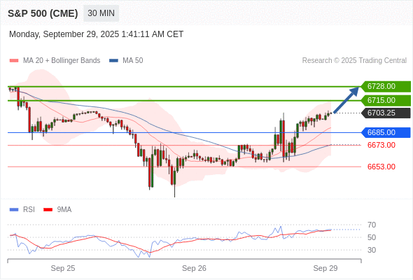 在 6685.00 之上,看涨,目标价位为 6715.00 ,然后为 6728.00 。
