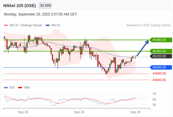 在 45040.00 之上,看涨,目标价位为 45300.00 ,然后为 45480.00 。