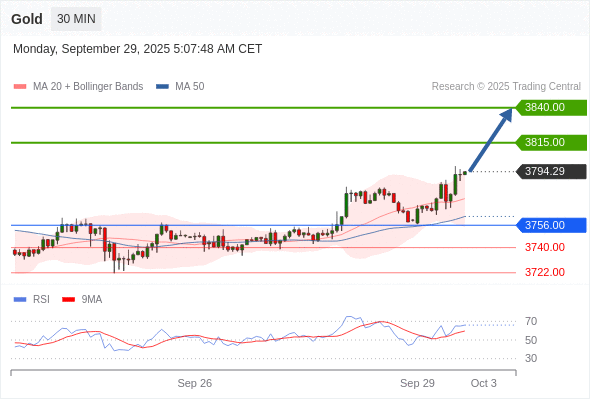 在 3756.00 之上,看涨,目标价位为 3815.00 ,然后为 3840.00 。