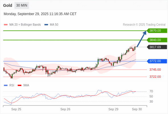 在 3772.00 之上,看涨,目标价位为 3840.00 ,然后为 3870.00 。