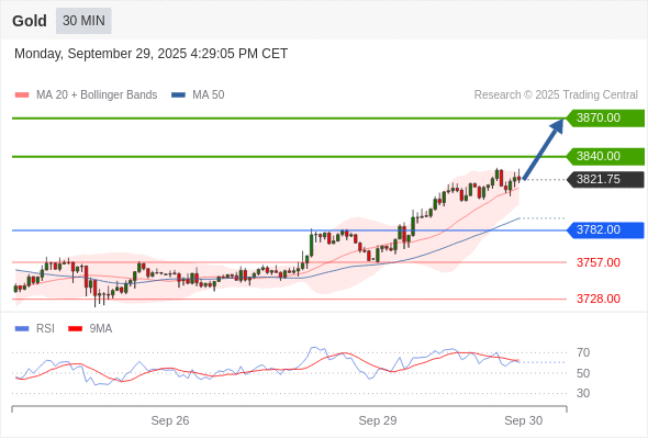 在 3782.00 之上,看涨,目标价位为 3840.00 ,然后为 3870.00 。
