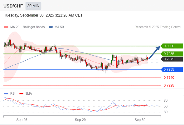 在 0.7955 之上,看涨,目标价位为 0.7985 ,然后为 0.8000 。