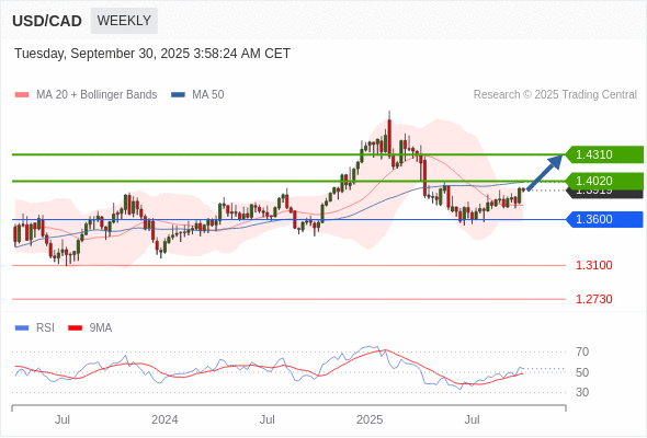 在 1.3600 之上,看涨,目标价位为 1.4020 ,然后为 1.4310 。