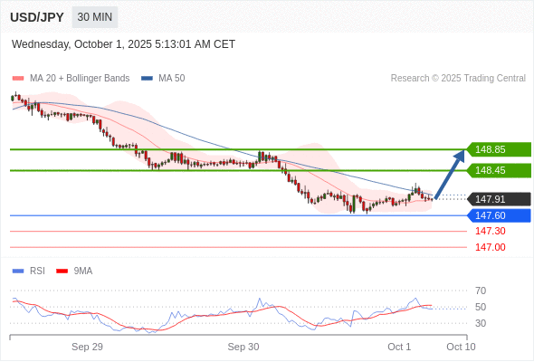 在 147.60 之上,看涨,目标价位为 148.45 ,然后为 148.85 。