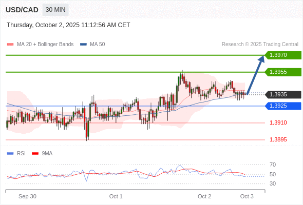 在 1.3925 之上,看涨,目标价位为 1.3955 ,然后为 1.3970 。