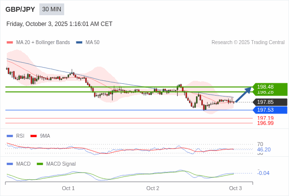 英镑/日元 当日内 : 有上涨的可能,目标价位定在 198.48 。