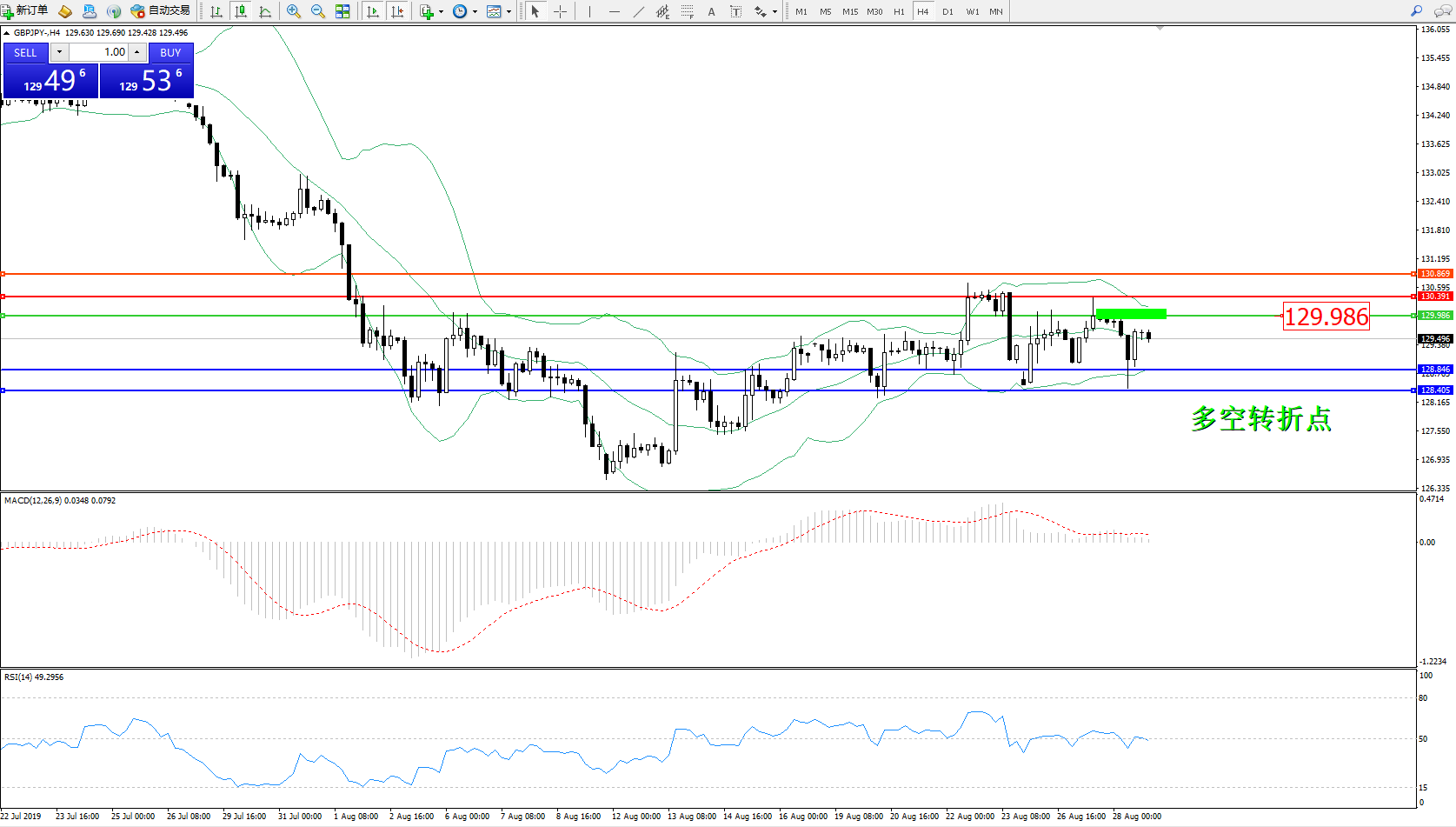 交易策略:129.986下方看跌,目标128.846128.405