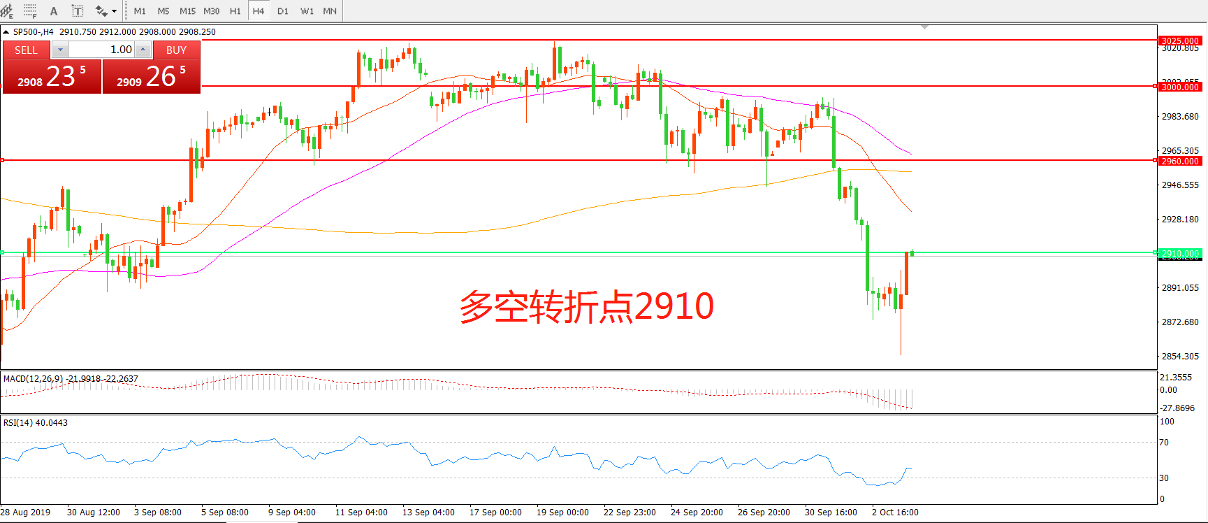 4小时图看,标普500探底回升,跌势有所缓解,2910再次成为关注焦点,均线系统拐头向下,MACD绿柱缩短,RSI指标拐头走平,日内延续下行较大。