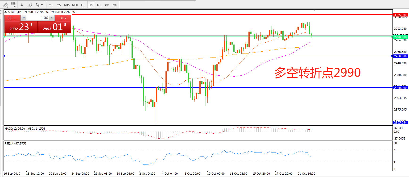 4小时图看,标普500震荡回落,2990成为下方支撑,整体走势仍然偏强,均线系统走平,MACD红柱减少,RSI指标向下,日内延续上行概率较大。