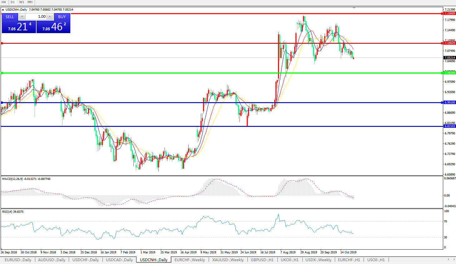 技术面简析:日图短期均线呈空头排列,汇价7.10关口承压持续小幅回落下修,MACD下穿0轴且量能0轴下方小幅放量,RSI持续走低,预计短期汇价将延续回落态势,汇价运行于7.00-7.10区间的概率较大;中美贸易后续谈判进展将决定汇价最终趋势。