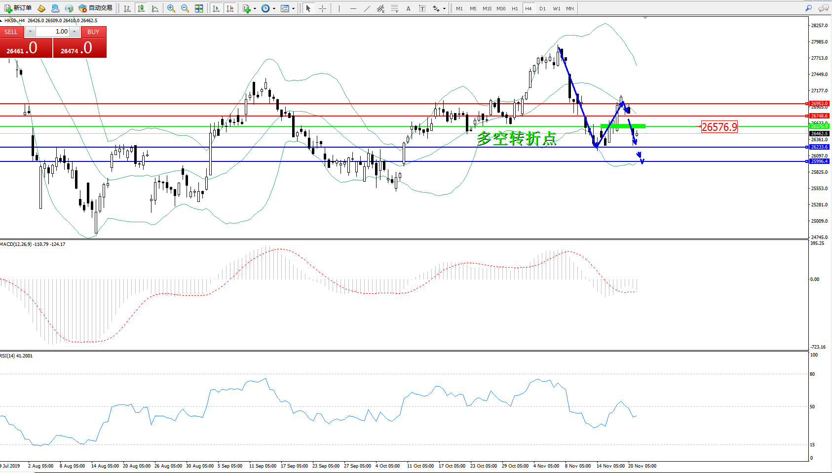 香港恒生指数11月21日(周四)收盘下跌422.73点,跌幅1.57%,报26466.88点;港股早上跟随外围大幅低开,并再扩大跌幅,恒指低见26306,由于两大变数依然未有改善迹象,因此港股要再作突破,似乎欠缺实质支持,预期港股仍会继续于26000-27000点上落。 美企业绩期接近尾声,加之国际贸易前景转弱,拖累周三美股三大指数从纪录高位下滑。中国人民银行近期政策频出,调低了MLF和逆回购利率后,周三还下调了1年期LPR利率至4.15%,降了5个基点,对未来长线利率宽松有重大指引作用。这一系列举措一方面对内地经济形成利好。但国际贸易前景不确定增加,市场转向观望。