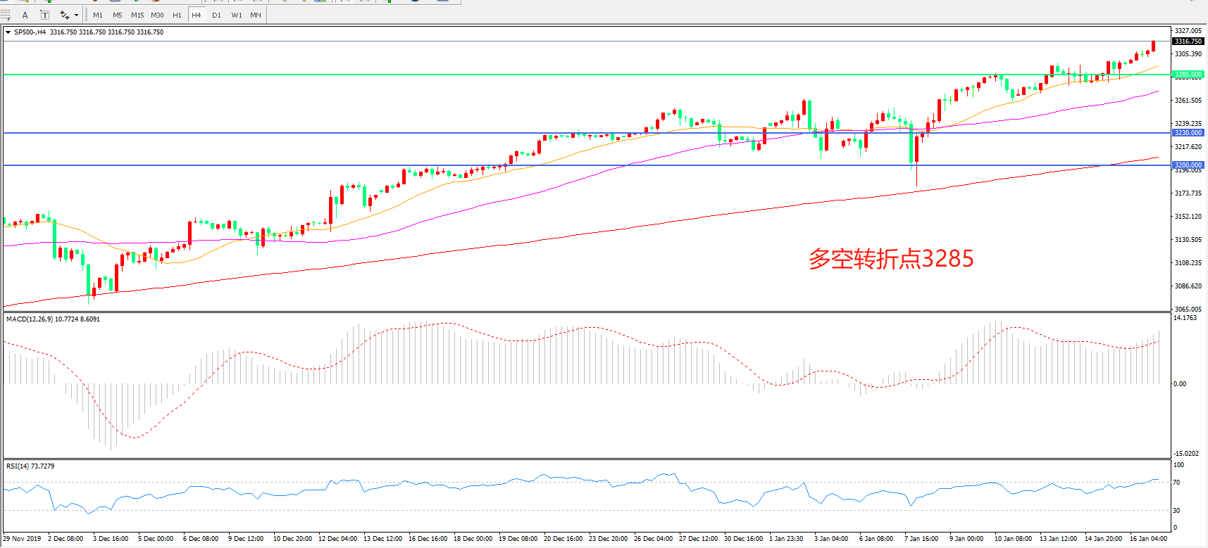 4小时图看,标普500阳线连续拉升,整体走势偏强,均线系统呈多头排列,MACD红柱增加,RSI指标向上,日内延续上行概率较大。