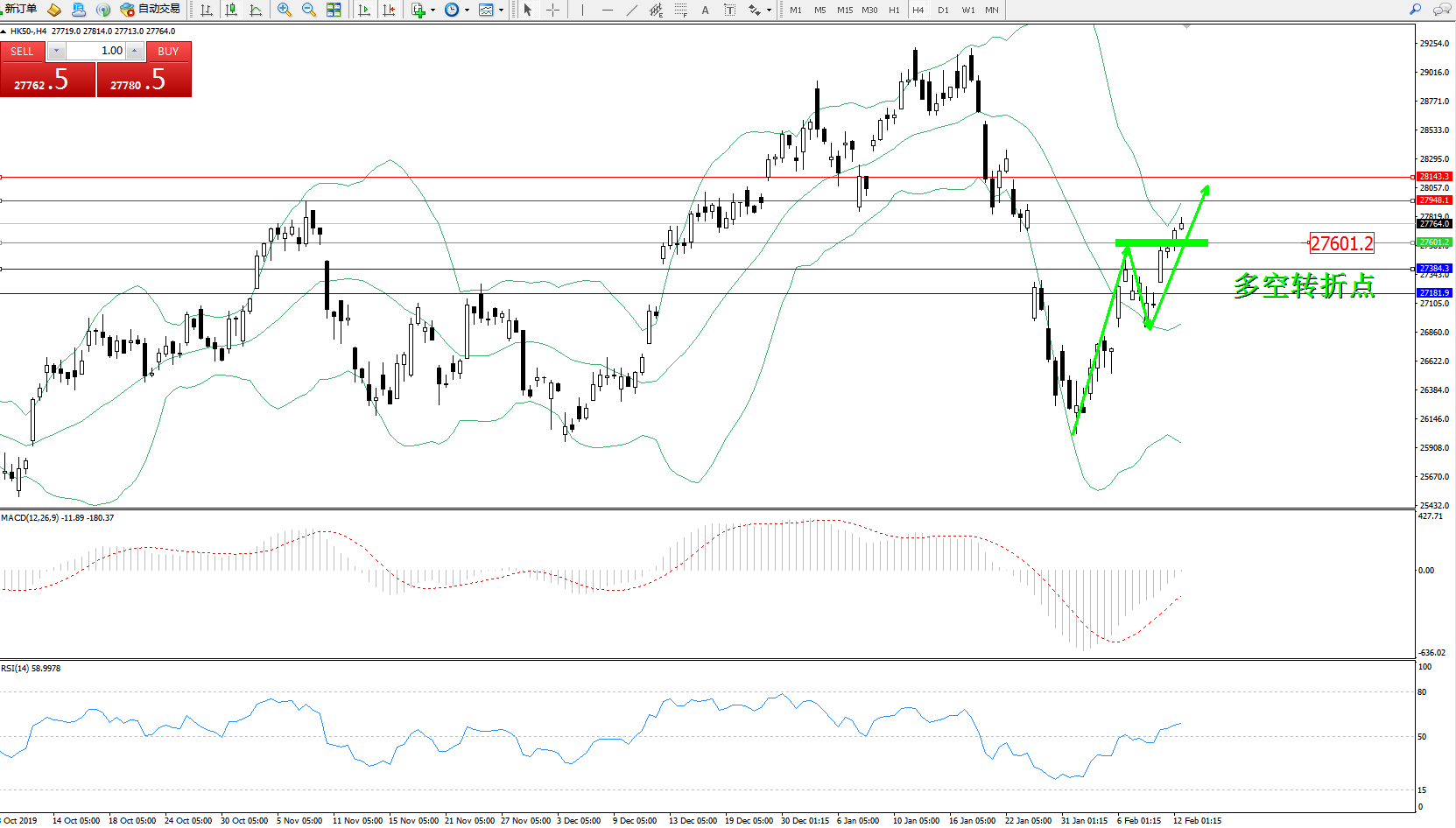 香港恒生指数2月12日(周三)收盘上涨239.78点,涨幅0.87%,报27823.66点;股市场延续反弹,主要股指震荡走高。恒指午后冲涨至1%,行业板块集体狂欢,近乎全部上涨。全国新型肺炎治愈比例达10.6%,疫情影响持续下降,市场风险偏好逐步回升。主板全日成交1122.34亿港元,港股通净流入63.06亿港元。全球景气周期可能逐步见底,流动性整体仍然宽松,资金流入股市的趋势仍在继续,市场整体估值并不高,港股估值相对更具吸引力。疫情对市场的冲击短暂。长线资金正在趁回调积极布局,疫情引发市场对于企业线上业务的关注,线上业务多的个股在疫情期间表现抗跌。