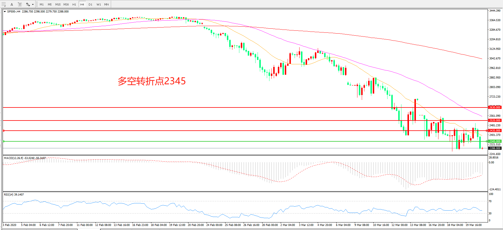 4小时图看,标普500延续震荡下行,整体走势十分低迷,均线系统呈空头排列,MACD绿柱增加,RSI指标走平,日内震荡下行较大。