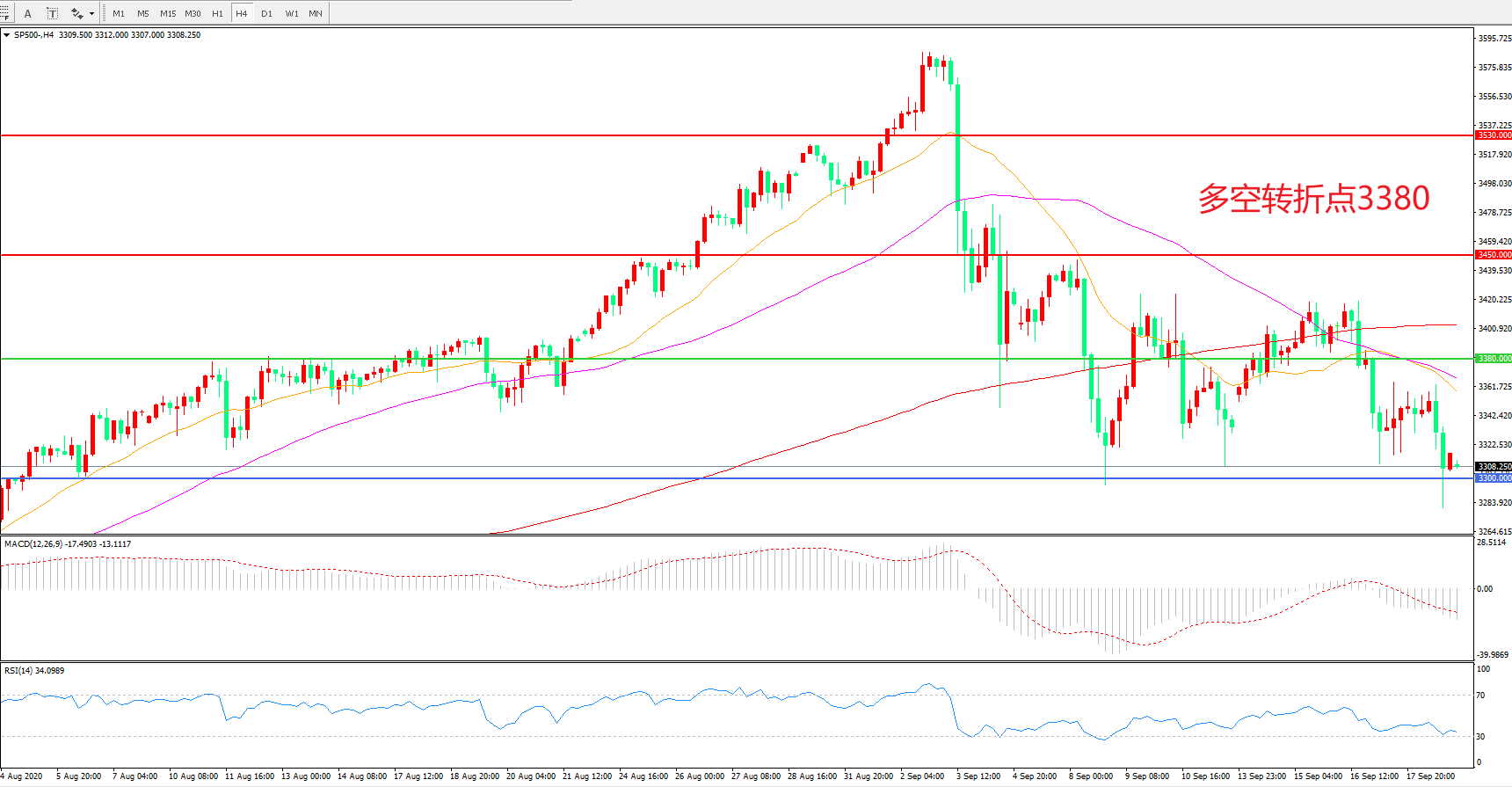 4小时图看,标普500长阴下破,短期走势十分低迷,均线系统拐头向下, MACD绿柱增加,RSI指标走平,日内震荡下行概率较大。