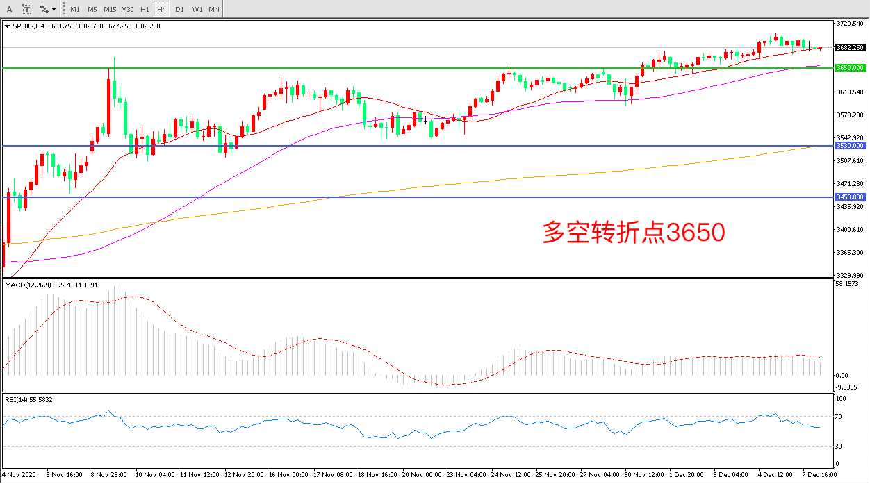 4小时图看,标普500延续高位震荡,上行趋势稳健,3650成为短期多空分水岭,21周期均线成为短期支撑, MACD红柱增加,RSI指标向上,日内延续上行概率较大。