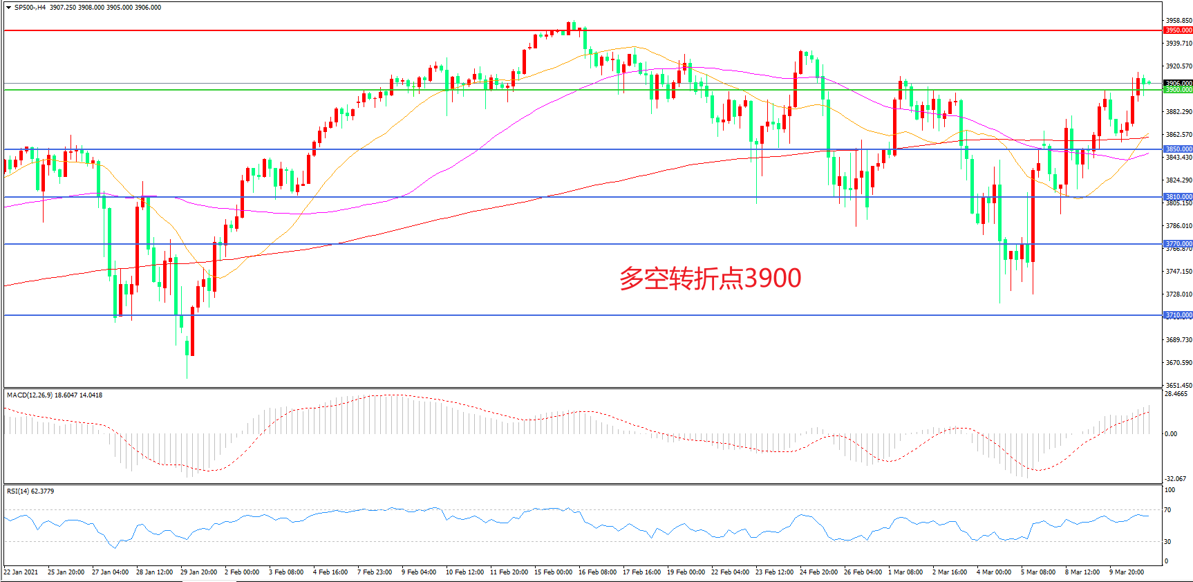4小时图看,标普500长阳拉升,短期走势有所回暖,均线系统走平形成下方支撑,3900成为多空分水岭 , MACD红柱增加,RSI指标走平,日内震荡上行概率较大。