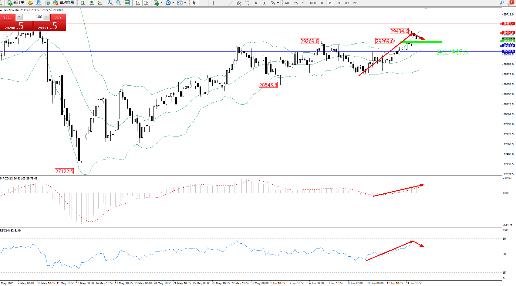 技术点评:多头动力延续布林带指标通道上轨附近节点不断向上拉升中,高位抵达29434附近整理后遇阻回撤,短期开始弱势高位徘徊,布林带指标呈缓慢张口走势持续中,MACD指标处于0轴线上方多头区域持续整理平移,RSI指标处于多头区域高位持续震荡后有平缓下移迹象;
