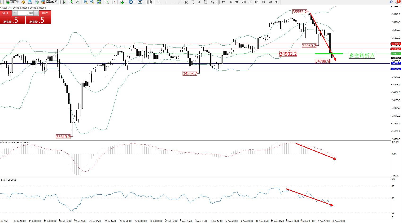 技术点评:空头动力延续布林带指标下轨附近节点不断向下移动中,低位抵达34788位置后得到短暂支撑,但下行趋势依旧存在,布林带指标呈张口走势中,MACD指标处于0轴线下方空头区域持续震荡下行,RSI指标处于50均衡线下方空头区域不断下移中;