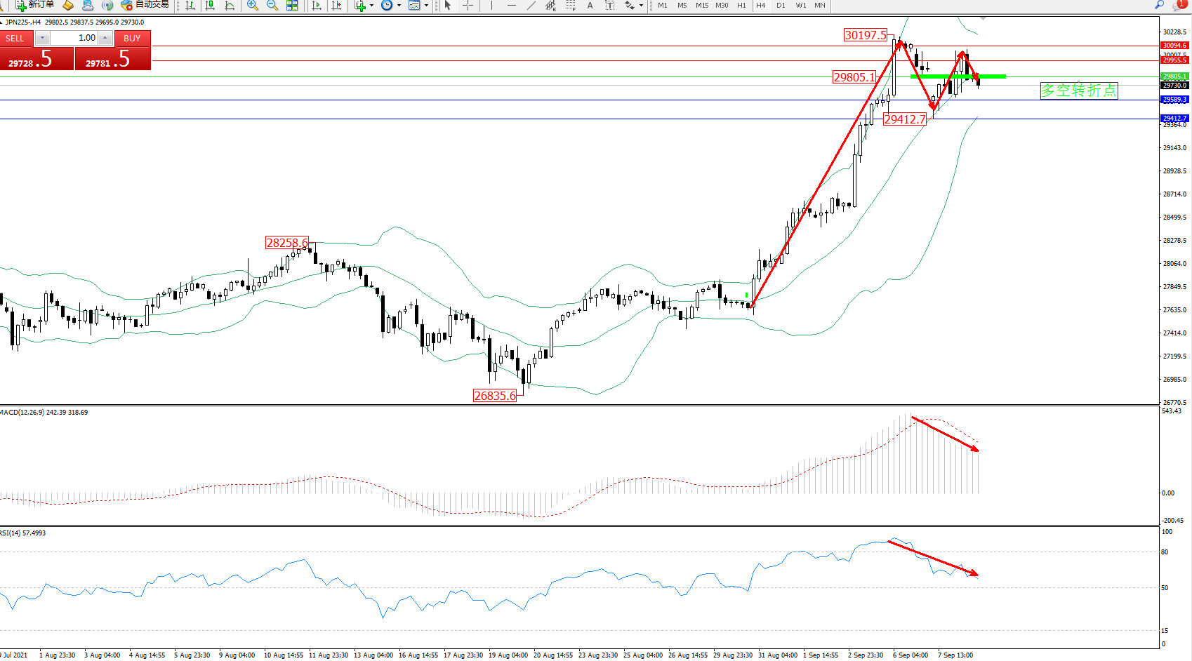 技术点评:多头动力延续布林带指标中上轨区间持续震荡上扬,高位抵达30197位置后遇阻回撤,纠结于中轨附近持续震荡,短期或维持整理缓慢下行走势,布林带指标呈收口走势中,MACD指标处于高位震荡缓慢下行,RSI指标处于多头区域持续震荡下行;